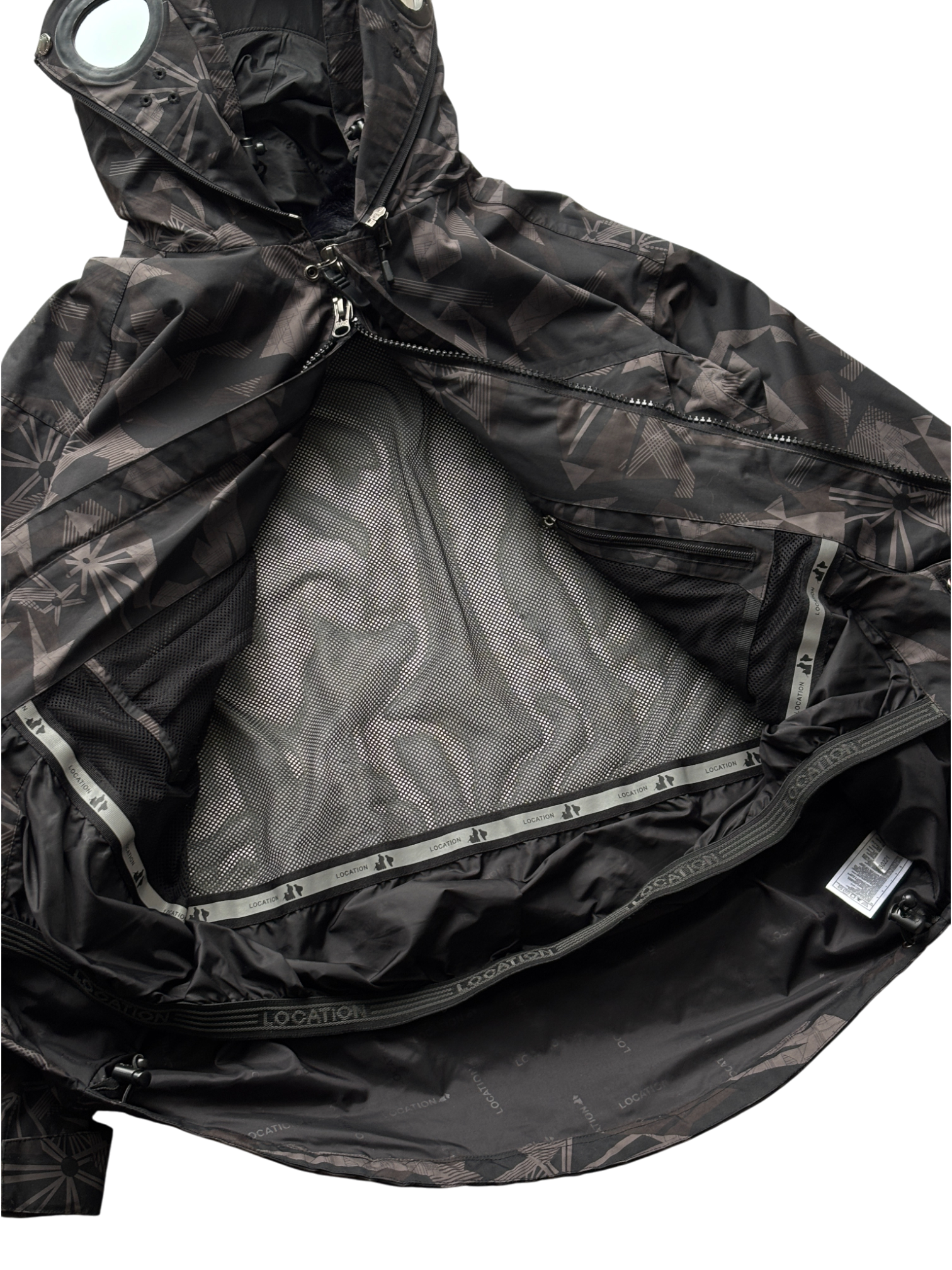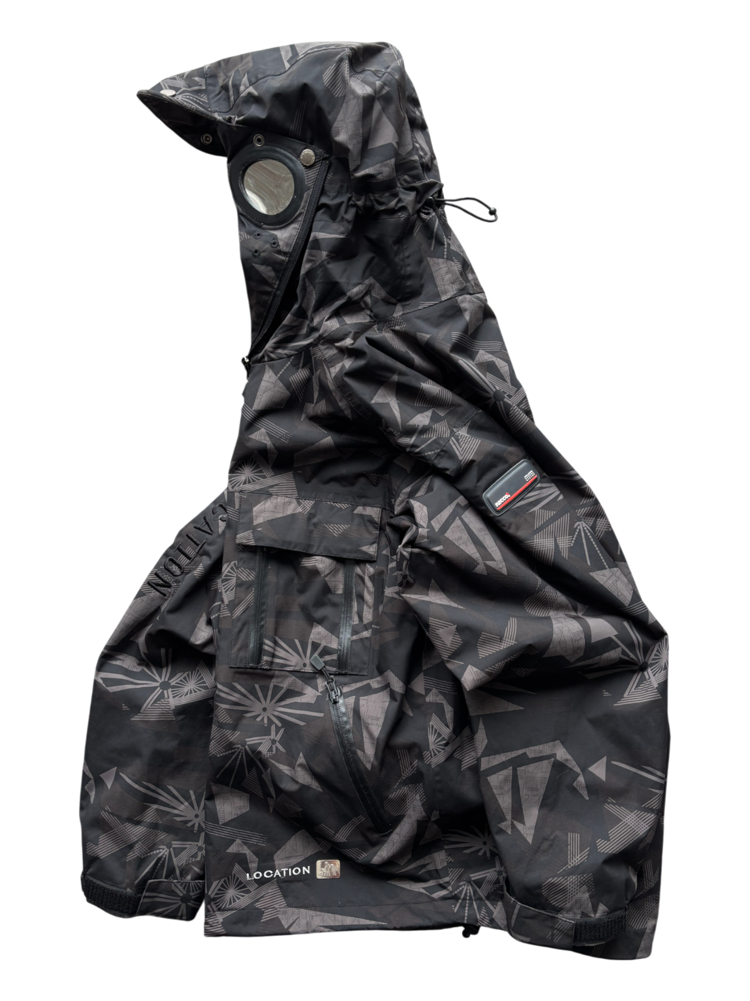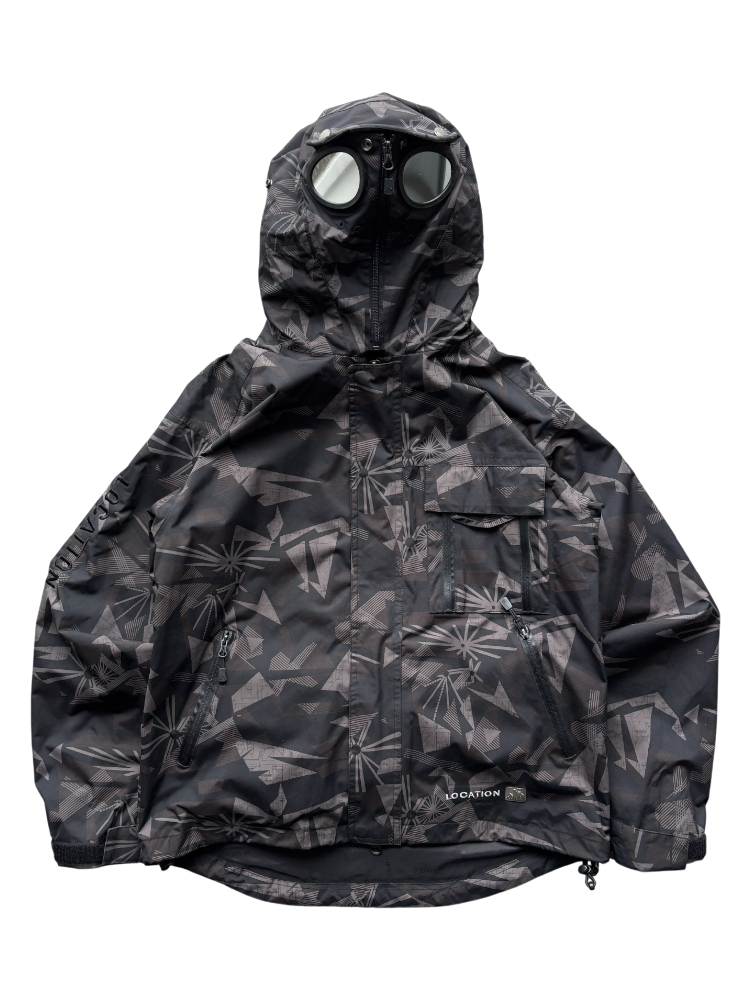 - Full-zip camouflage jacket with integrated face mask and built-in plastic goggle lenses, sleeve stash pocket