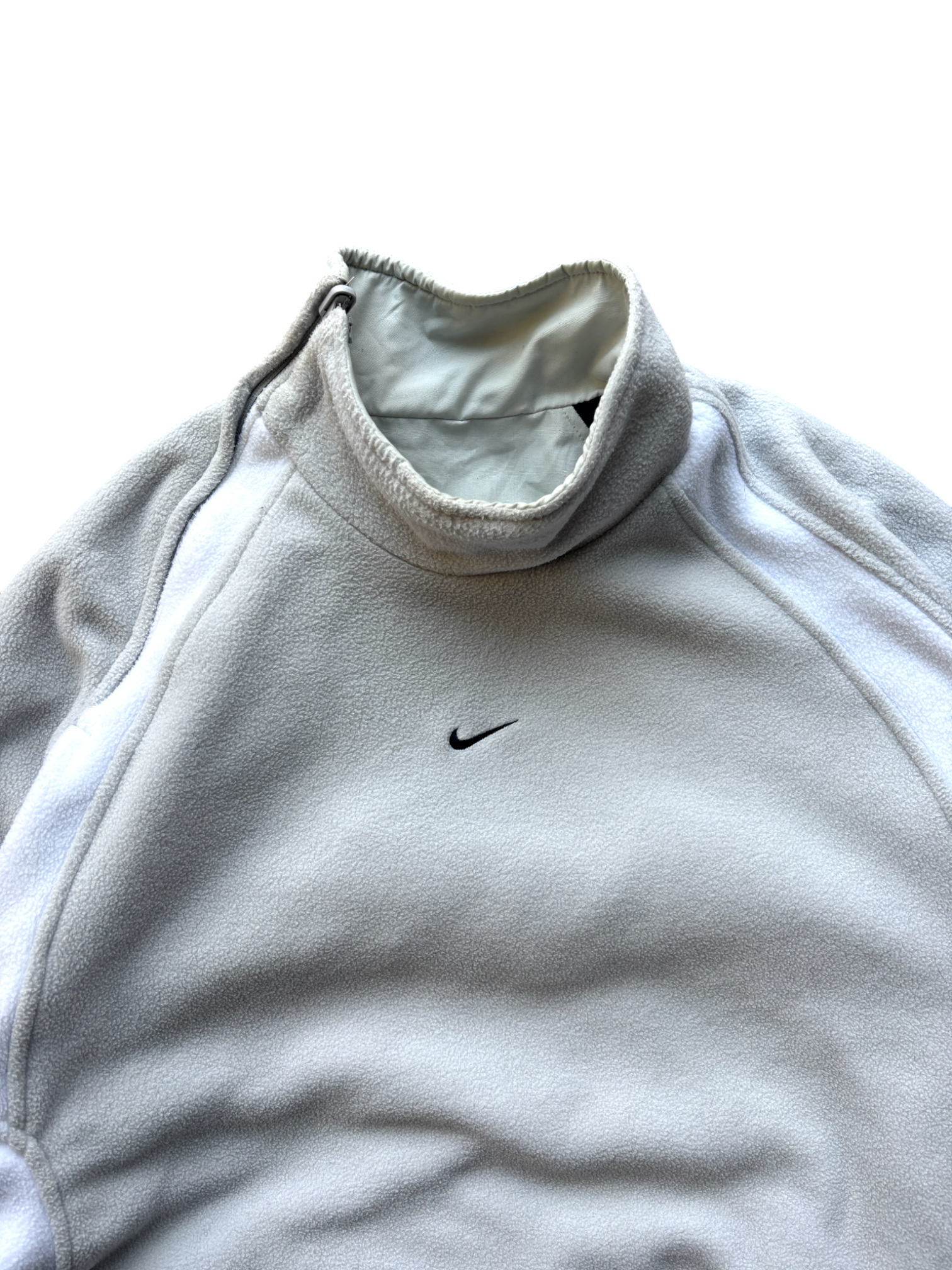 - Showcases a central small swoosh on the fleece interior and a raised rubber logo on the outer face, complemented by an offset shoulder zipper.