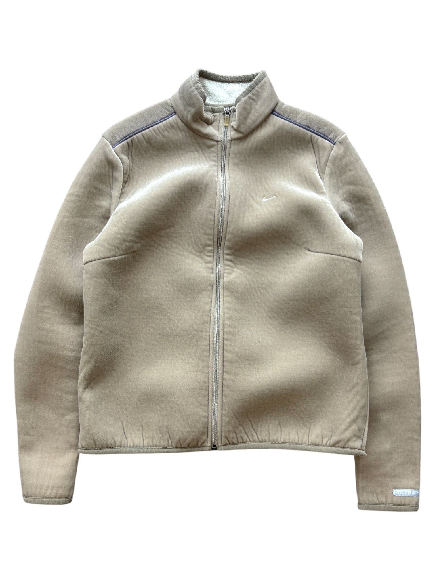 Introduced in Fall 2001, this piece belongs to a rare Nike line. It features a unique combination of velour and neoprene, offering a distinct texture and aesthetic. Typically available in black and beige, the jacket is notable for its sleek design and functionality, including hidden side pockets.
