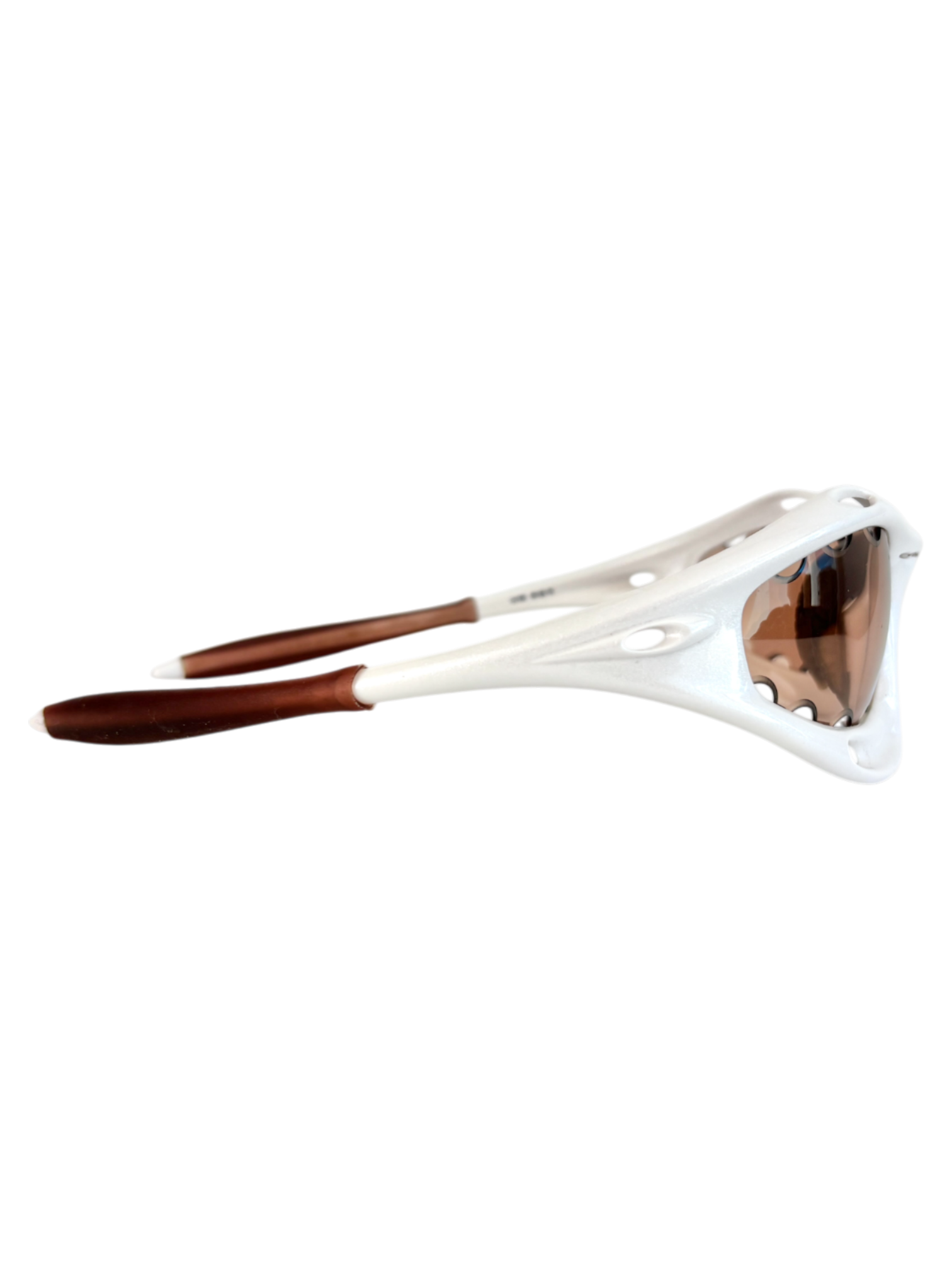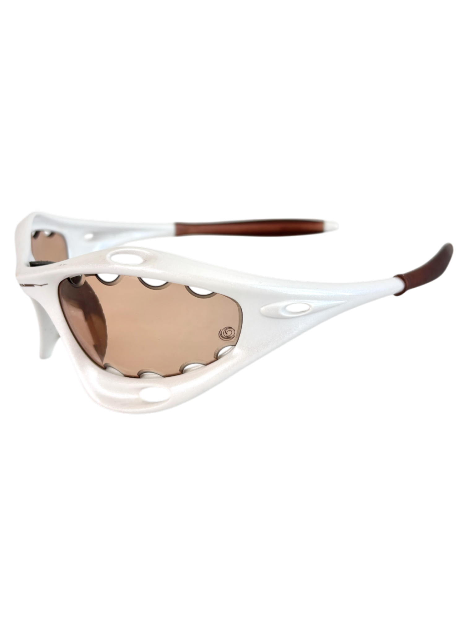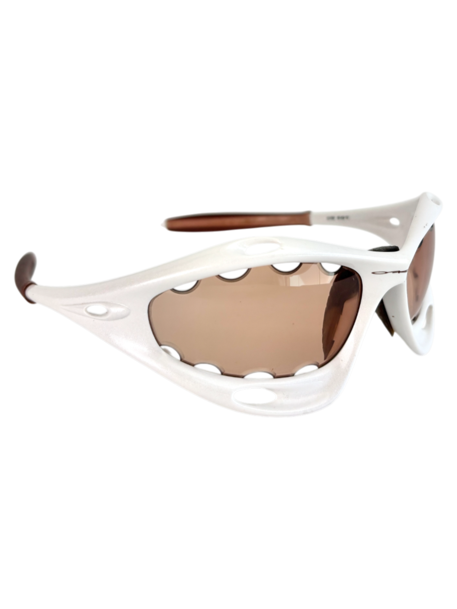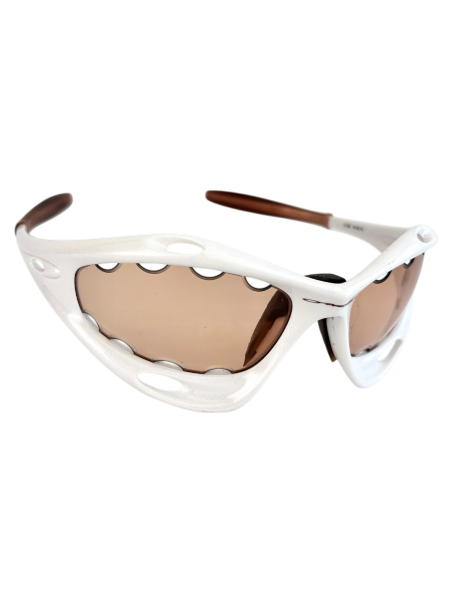 Released in the mid-1990s, the Oakley Pro Racing Jacket pushed performance eyewear forward with interchangeable lenses, aerodynamic design, and anti-fog vents. Building on models like the Eyeshades and M Frame, it embodied Oakley’s bold, tech-driven identity.