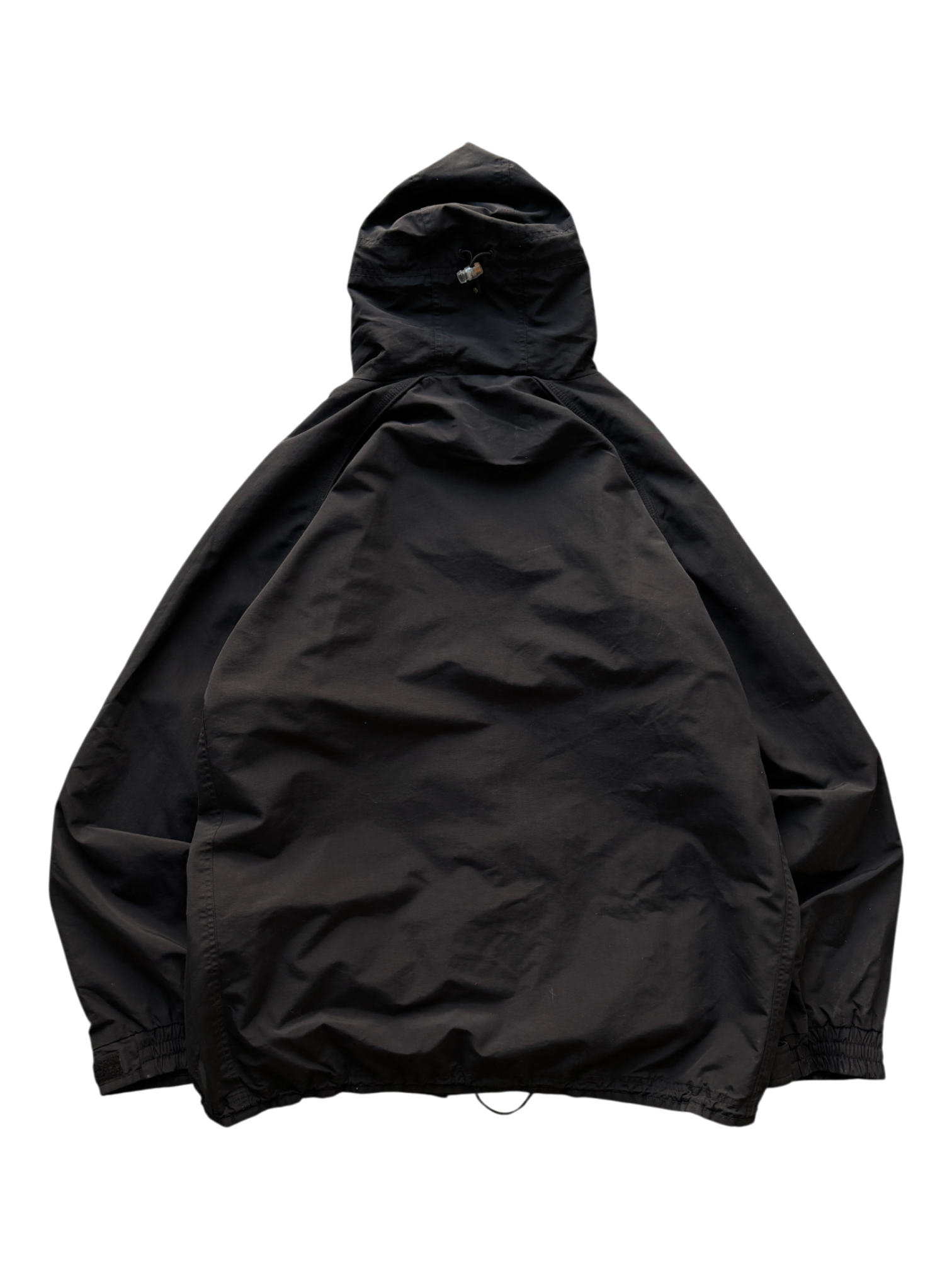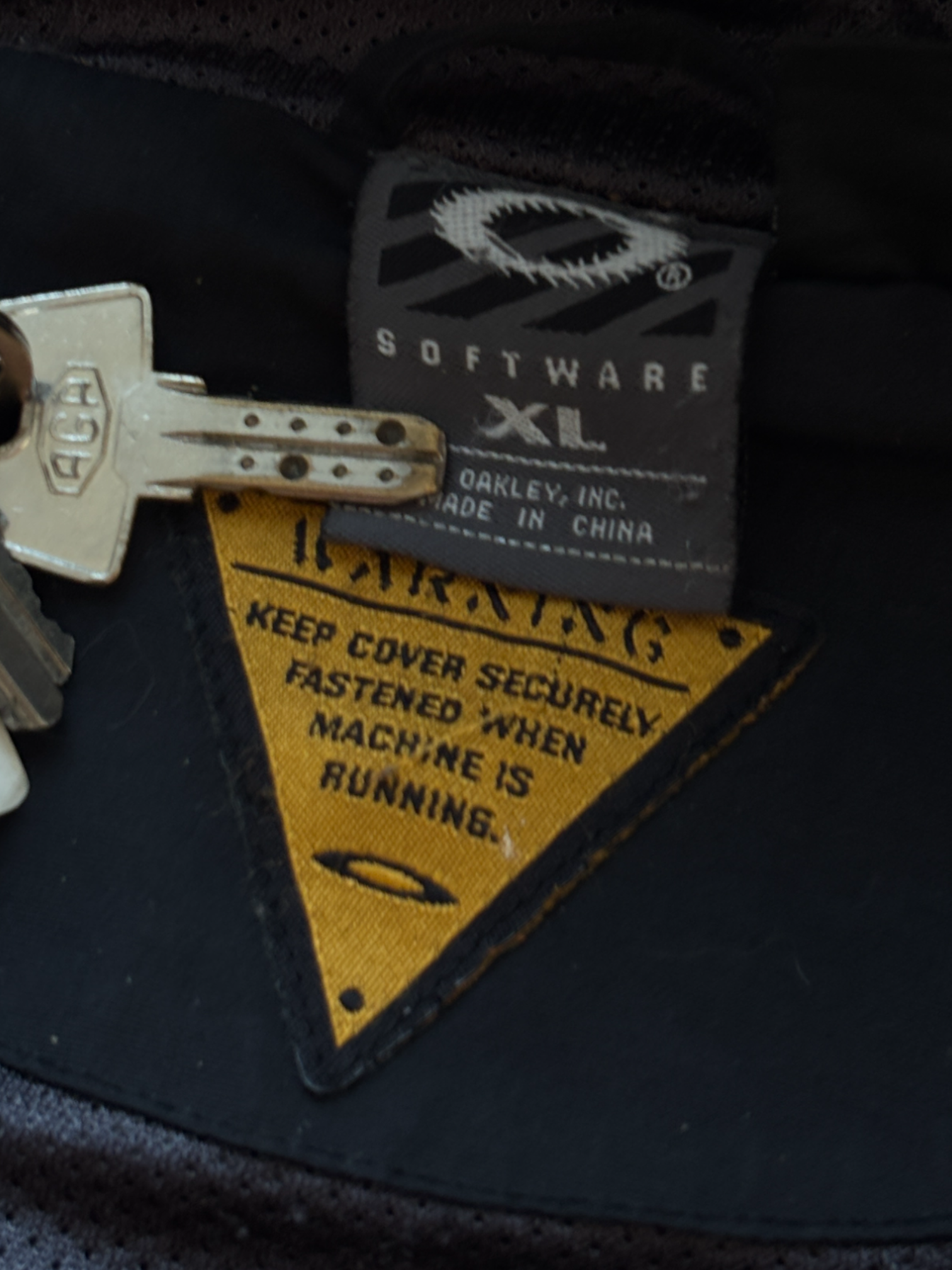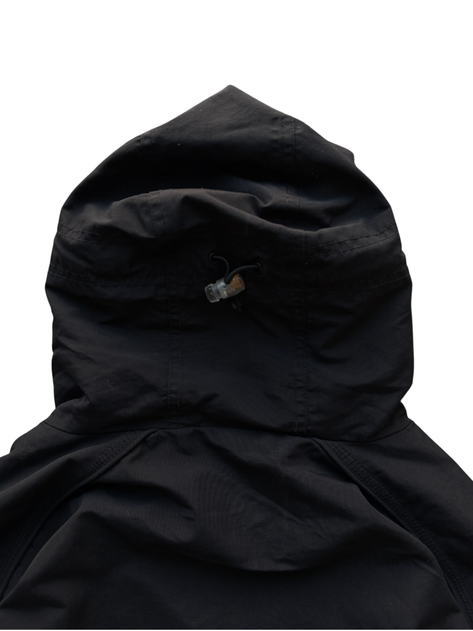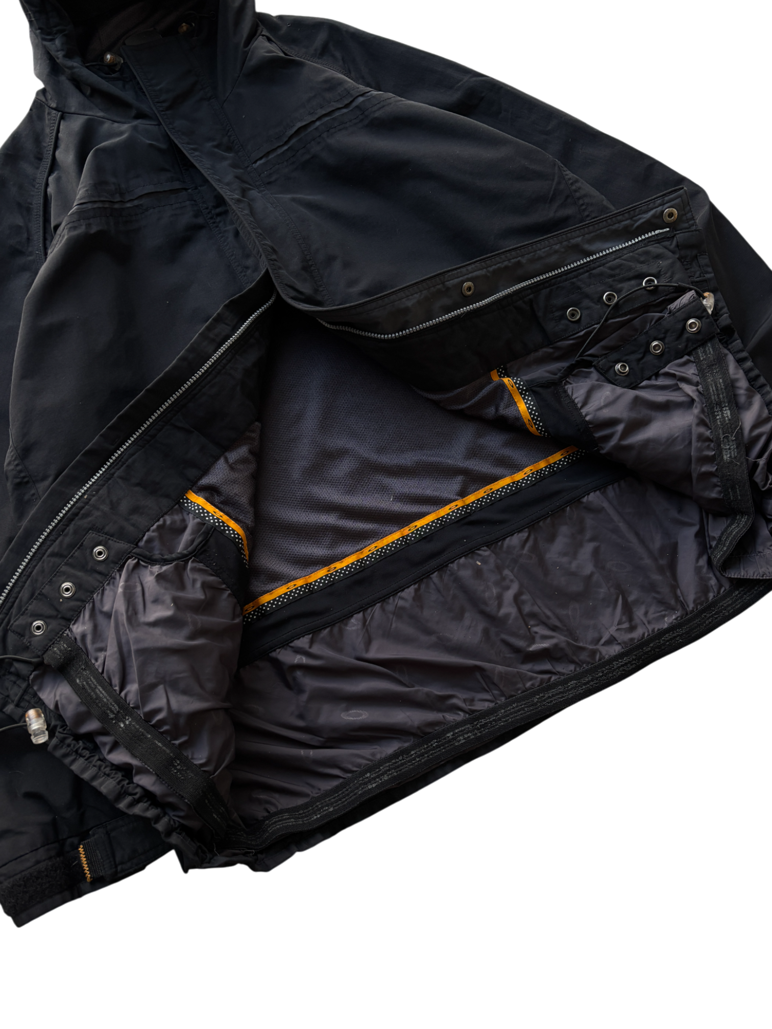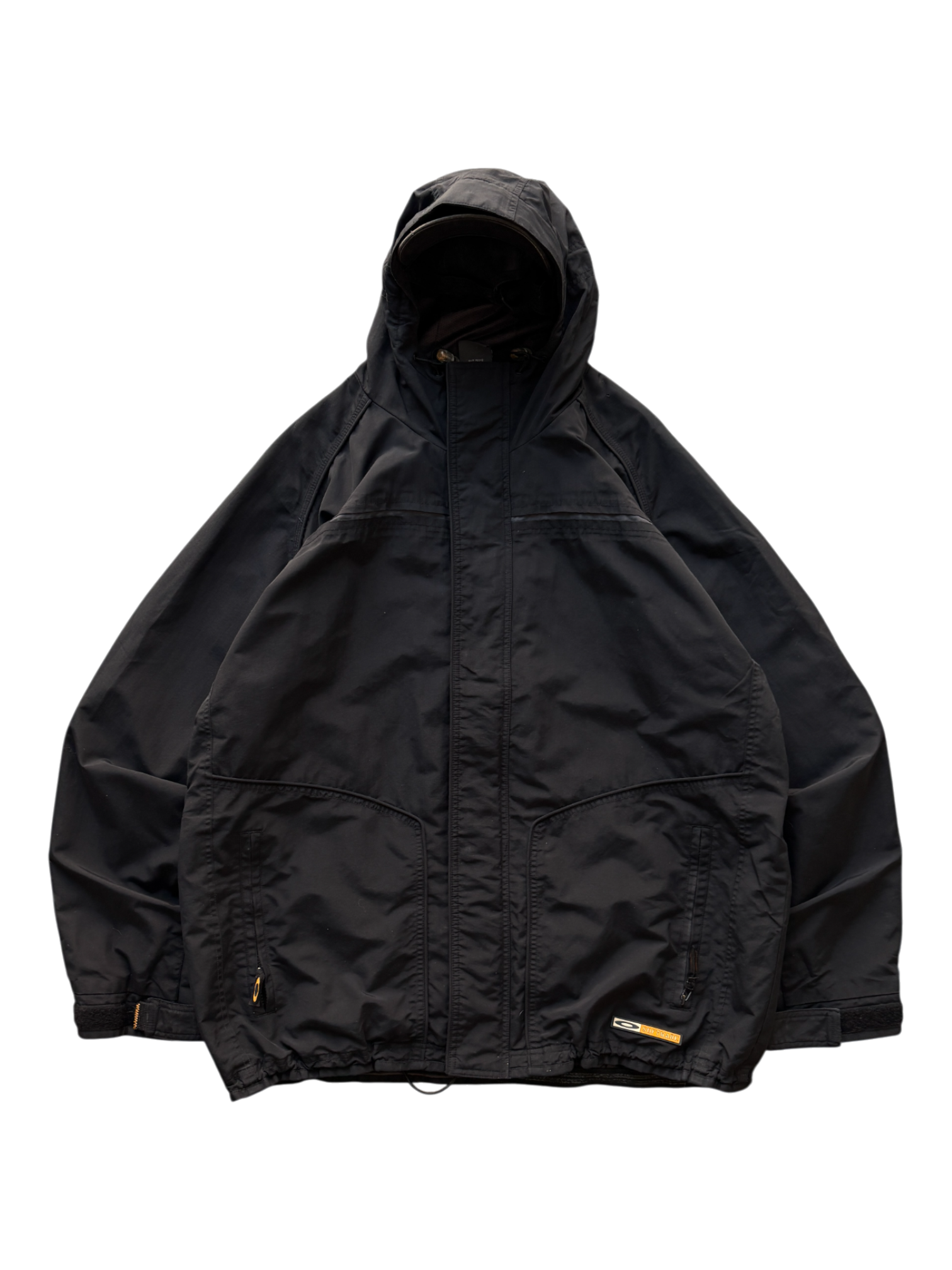 Waterproof jacket with adjustable cuffs, waist, and hood. Features underarm zippers for ventilation and multiple zip pockets for utility. Designed during the peak era of Oakley's technical apparel