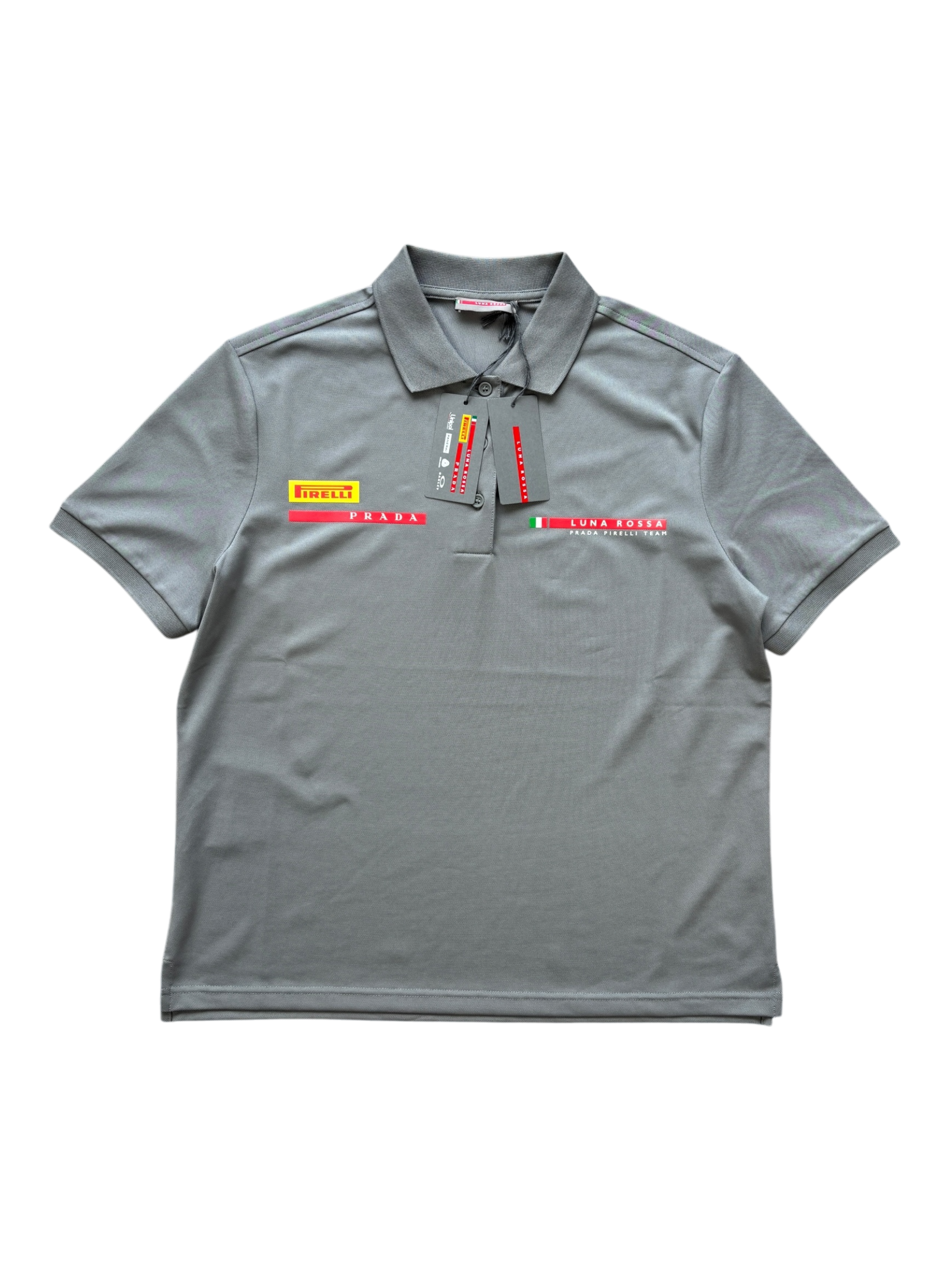 One of the standout pieces is the Prada Luna Rossa Pirelli men's polo, released for the 2024 edition. Made from a premium blend of 97% polyester and 3% elastane, it offers both comfort and a tailored fit. The design is sleek and minimalist, in a refined grey tone, with the Prada logo subtly placed on the chest.