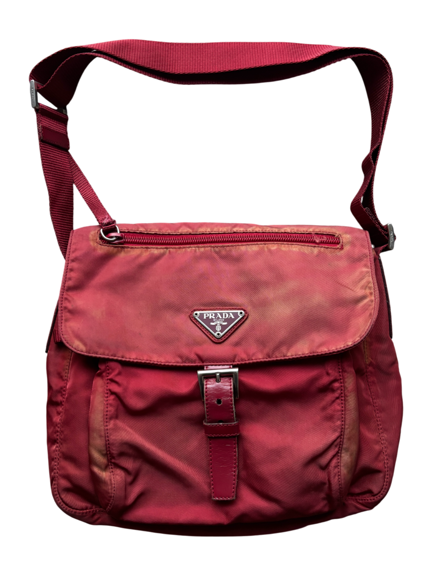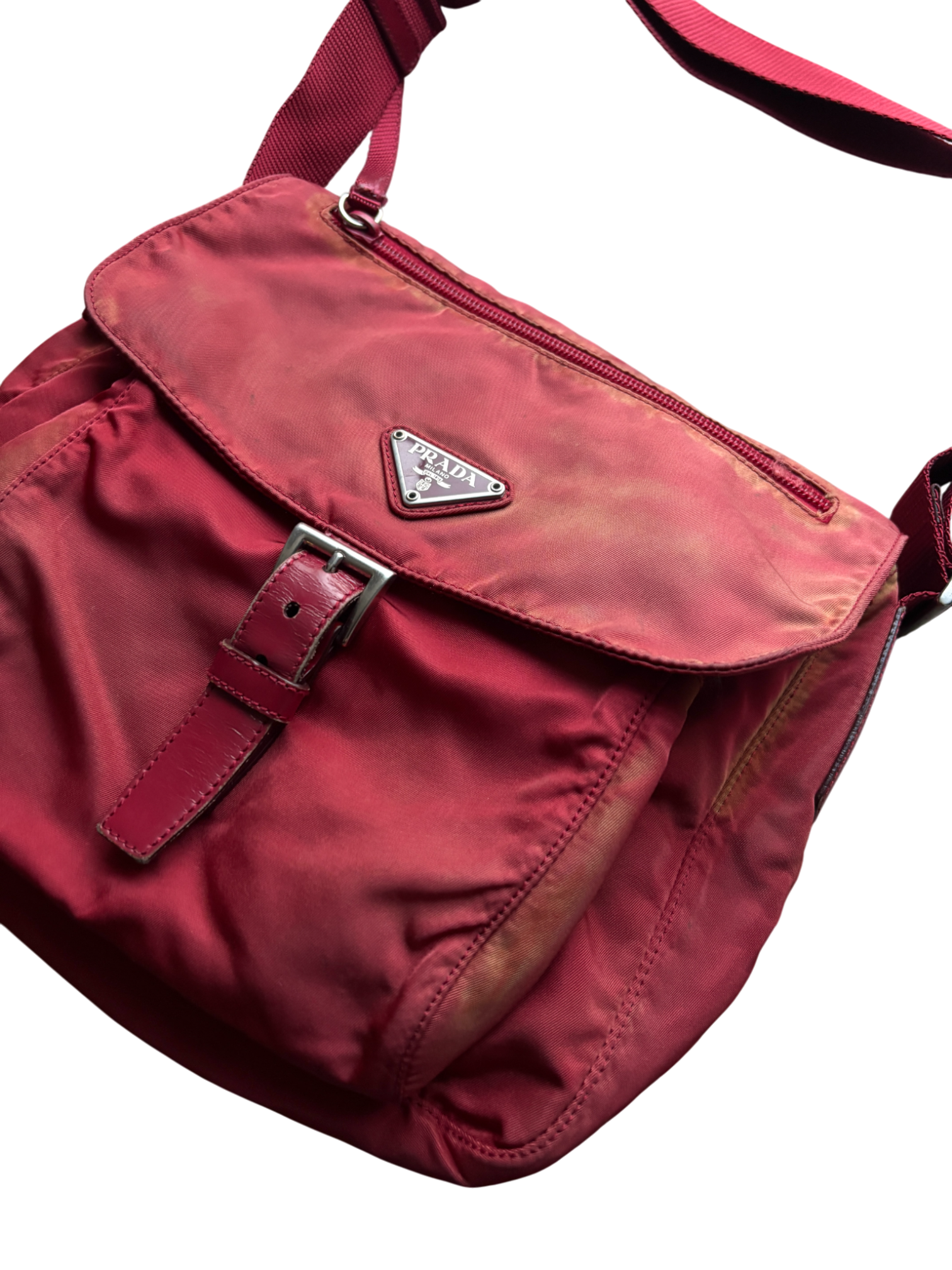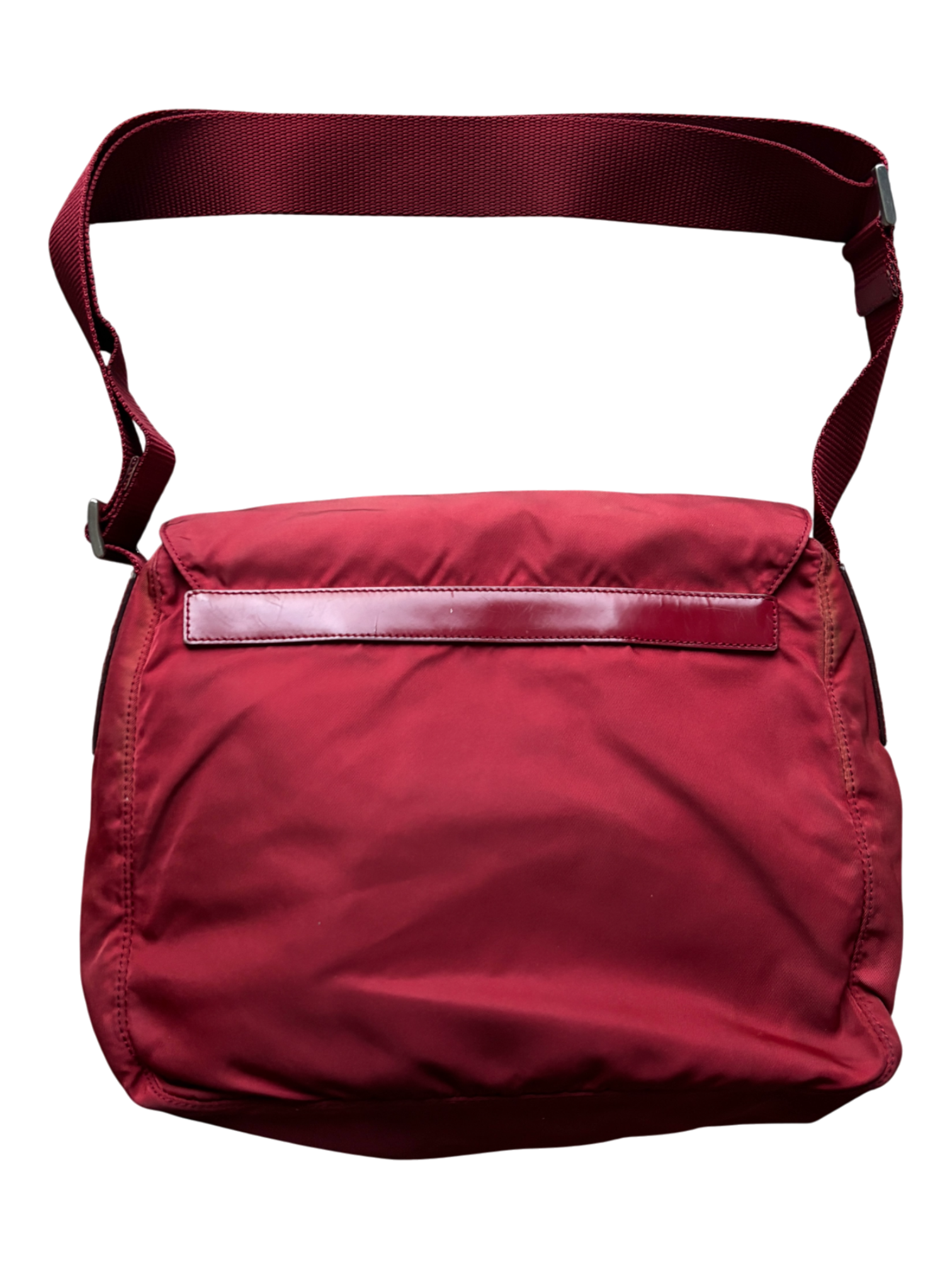 Nylon bag in burgundy with subtle sun-faded areas, featuring an adjustable strap and a belt-style buckle closure. Designed with two exterior compartments and one interior compartment for for organized carry.